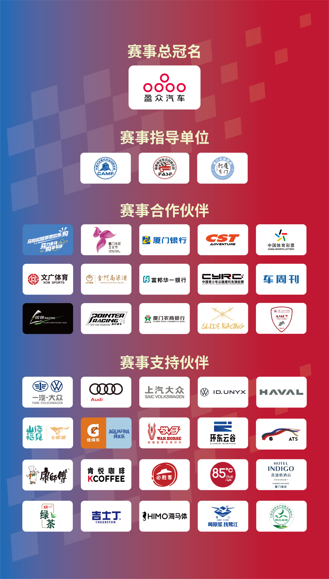 賽事由廈門市翔安區(qū)文化和旅游局、廈門市翔安區(qū)市場監(jiān)督管理局、廈門市翔安區(qū)婦女聯(lián)合會、廈門市翔安區(qū)內(nèi)厝鎮(zhèn)人民政府主辦;由中國汽車摩托車運動聯(lián)合會、福建省汽車運動聯(lián)合會、廈門市體育局、廈門市翔安區(qū)人民政府共同指導(dǎo);并得到了廈門文廣體育有限公司、廈門市翔安區(qū)文化館、廈門市翔安區(qū)青少年宮、指針賽車、銀驥賽車、中汽賽智(重慶)體育發(fā)展有限公司、廈門市翔安區(qū)吉他協(xié)會、廈門市翔安區(qū)音樂舞蹈協(xié)會、廈門市翔安區(qū)餐飲協(xié)會等單位和團(tuán)體的大力支持。