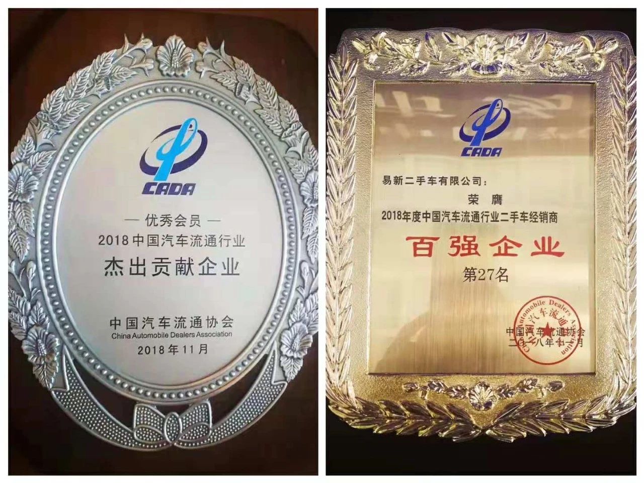 盈眾汽車集團榮獲2018中國汽車流通行業(yè)杰出貢獻獎;易新二手車榮膺2018年度中國汽車流通協(xié)會二手車經(jīng)銷商百強企業(yè)第27名。