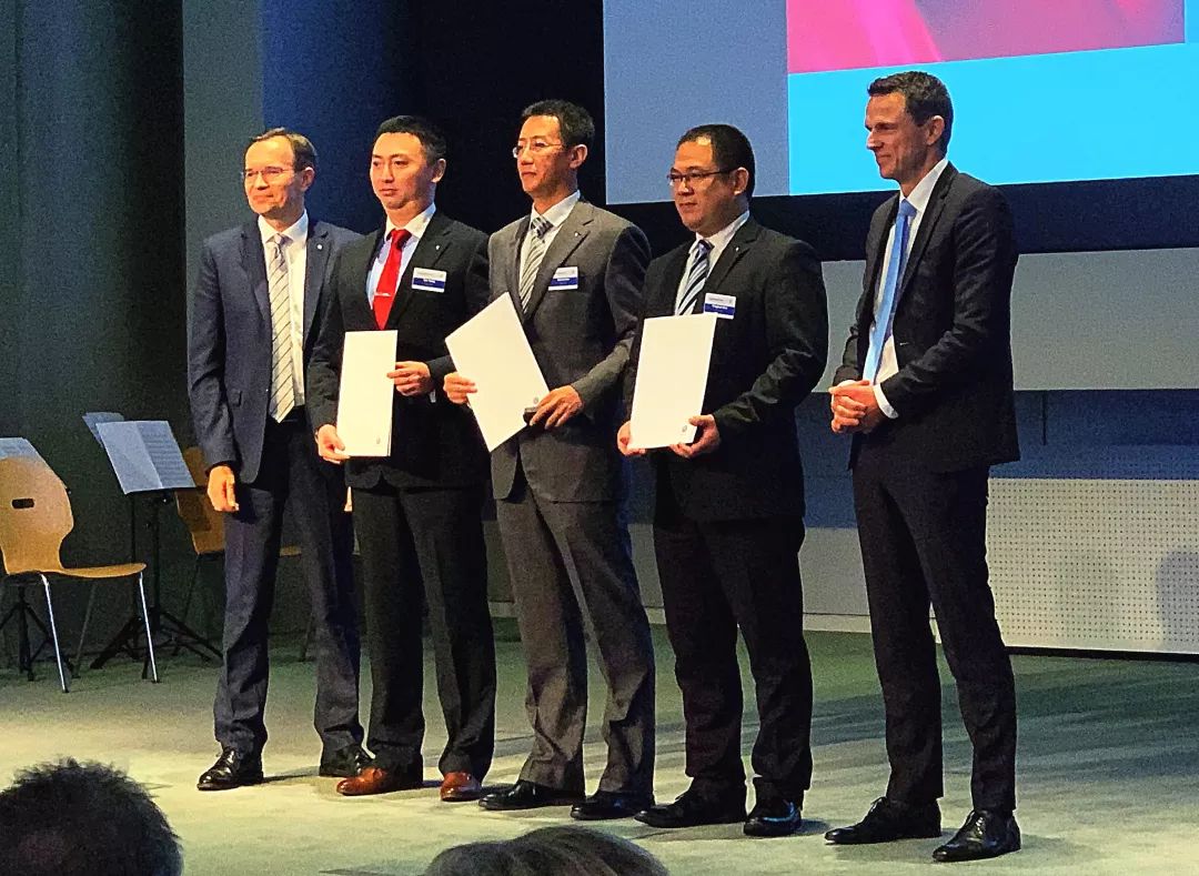 盈眾汽車代表孫聘仁、高廷建與大眾集團(tuán)領(lǐng)導(dǎo)及獲獎(jiǎng)中國經(jīng)銷商伙伴合影留念