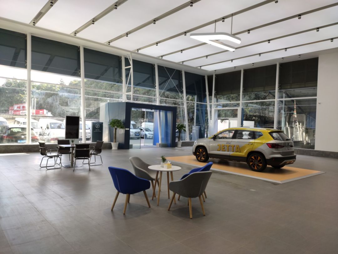 展廳設(shè)計富有工業(yè)風(fēng),店內(nèi)空間寬敞高雅。整潔明亮的大廳,點綴著紅、藍(lán)主題色,色彩俏皮的座椅和抱枕,讓時尚年輕的感覺撲面而來。大幅落地玻璃窗讓陽光自然地灑滿展廳,氛圍溫和又愜意。