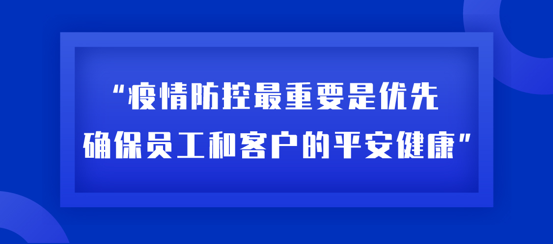 張總多次對工作小組強(qiáng)調(diào):“疫情防控最重要是優(yōu)先確保員工和客戶的平安健康”。陳主任表示,基層一線是對外服務(wù)的窗口,是防控工作重中之重,集團(tuán)全體同仁多一分擔(dān)當(dāng),員工的安全就多一分保障,我們的客戶和家人就多一分安康。