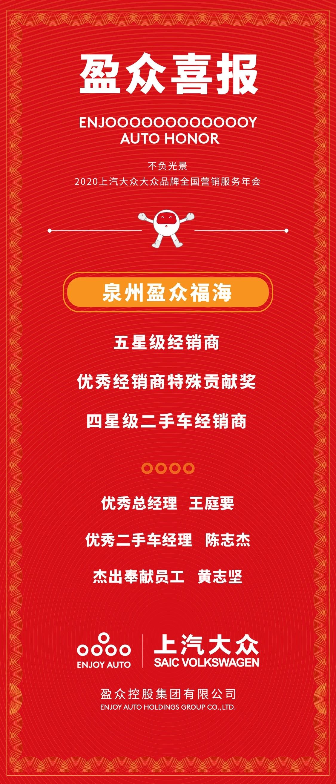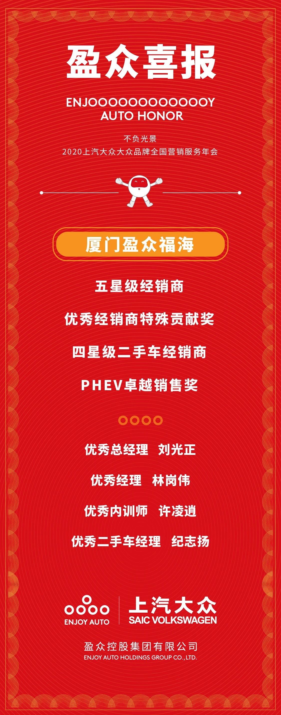 熱烈祝賀盈眾旗下廈門福海、泉州福海4S店從全國1000多家上汽大眾經(jīng)銷商脫穎而出,榮獲多項(xiàng)殊榮。