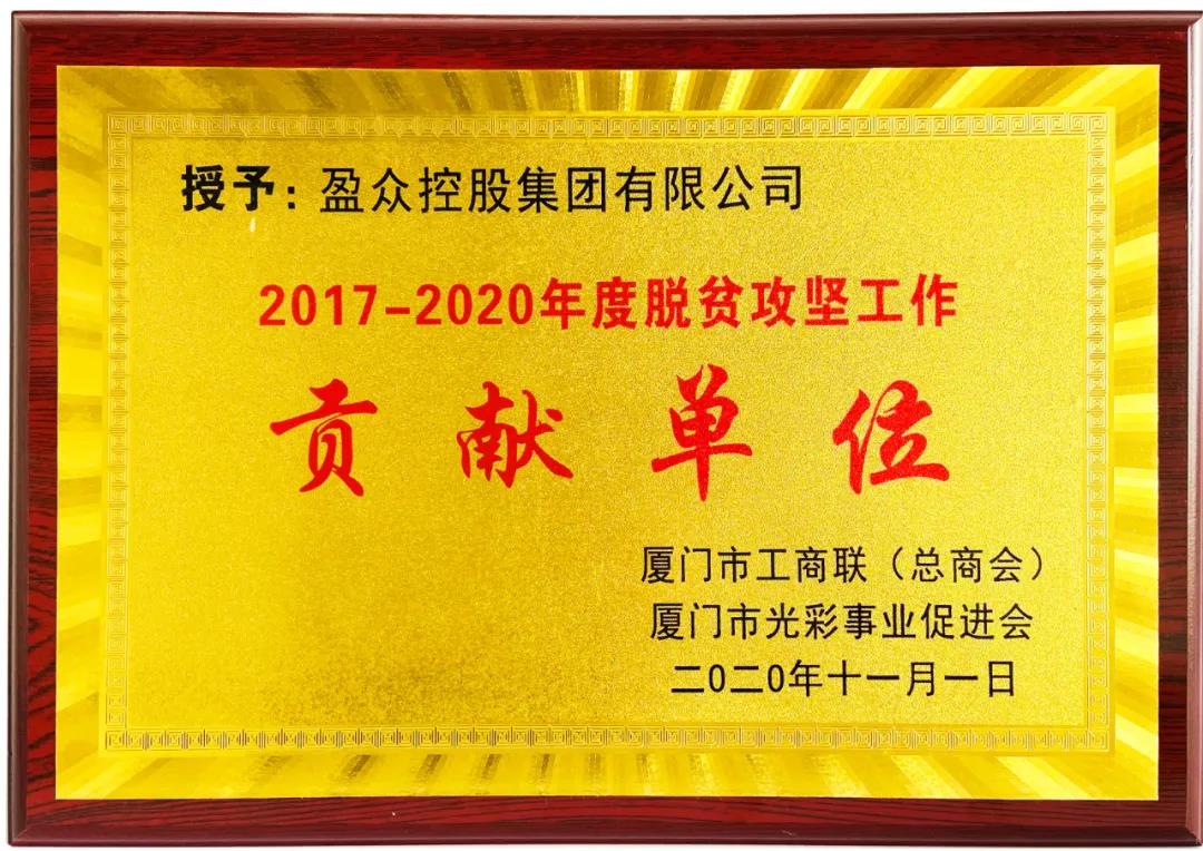 集團榮獲由廈門市工商聯(lián)(總工會)、廈門市光彩事業(yè)促進會共同頒發(fā)的“2017-2020年度脫貧攻堅工作貢獻單位”榮譽,表彰盈眾多年來持續(xù)關注脫貧攻堅事業(yè),積極開展向甘肅臨夏州定向捐資精準扶貧、線上助農義賣活動等舉措,為脫貧攻堅做出自己的貢獻。