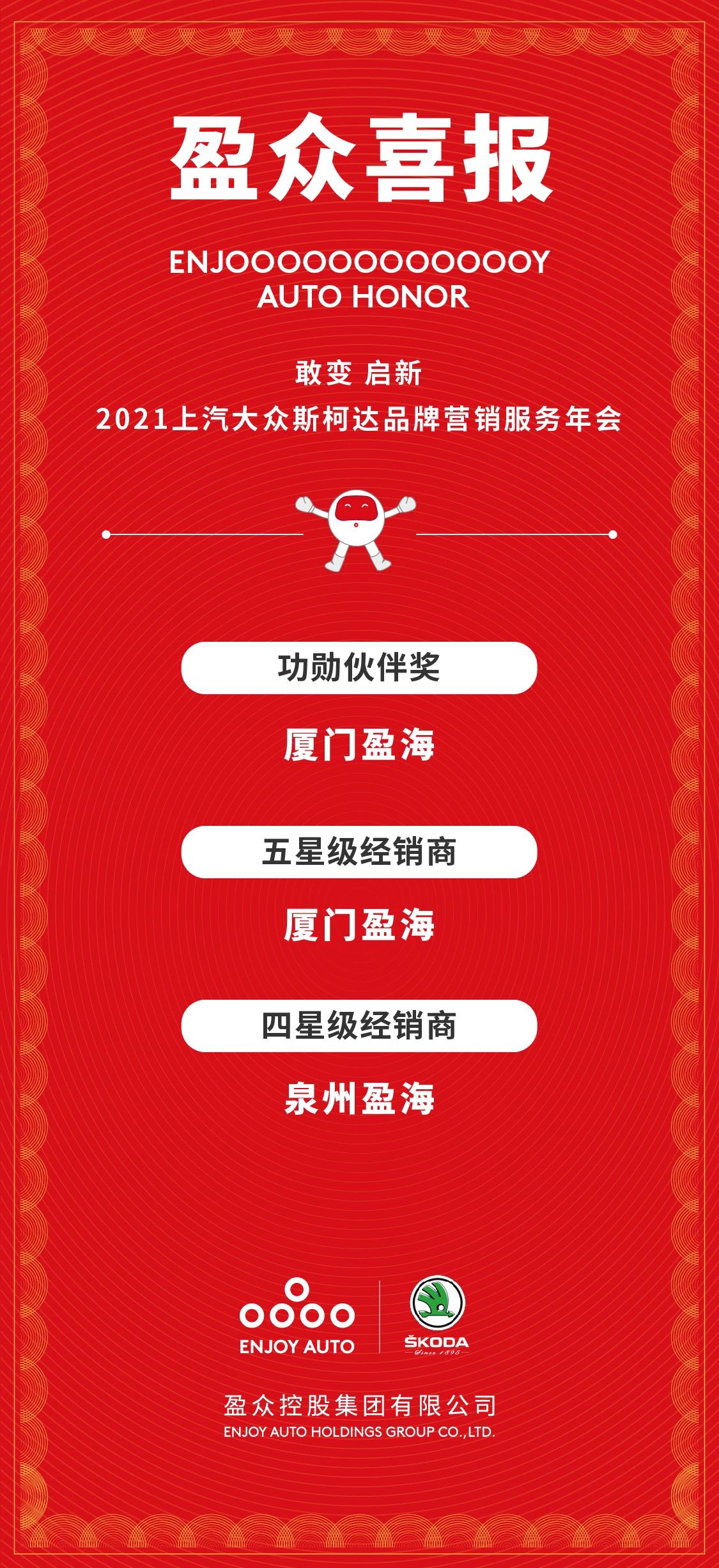 【喜報(bào)】盈眾榮獲2021上汽大眾斯柯達(dá)功勛伙伴獎(jiǎng)、五星級(jí)經(jīng)銷(xiāo)商等多項(xiàng)大獎(jiǎng)