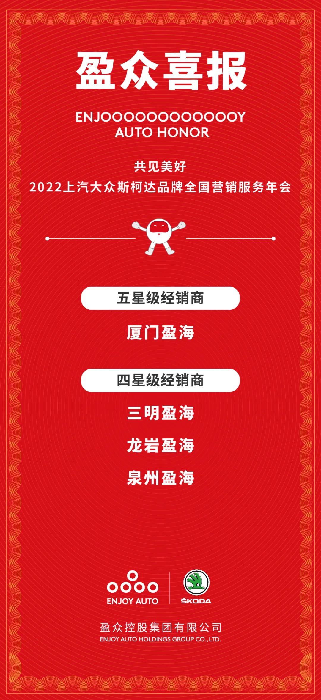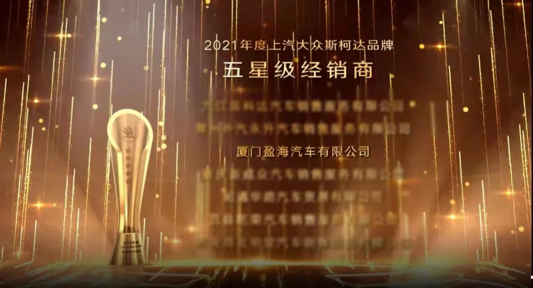 盈眾控股集團(tuán)憑借2021年出眾的銷售業(yè)績、高標(biāo)準(zhǔn)的服務(wù)水平以及優(yōu)秀的企業(yè)經(jīng)營能力,榮獲多項(xiàng)大獎(jiǎng)。其中,廈門盈海再獲上汽大眾斯柯達(dá)品牌五星級(jí)經(jīng)銷商榮譽(yù)稱號(hào),這是廈門盈海第13次獲得五星級(jí)經(jīng)銷商榮譽(yù)稱號(hào),三明盈海、龍巖盈海、泉州盈海榮獲四星級(jí)經(jīng)銷商榮譽(yù)稱號(hào)。