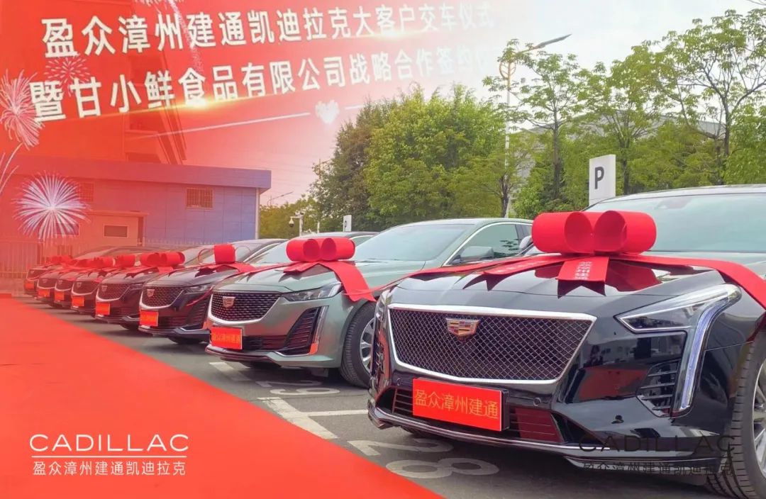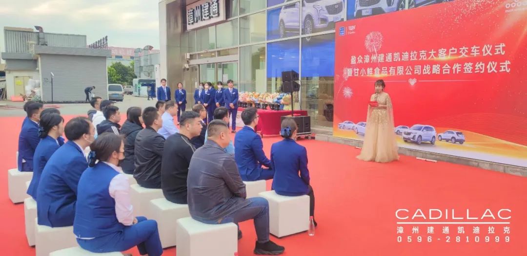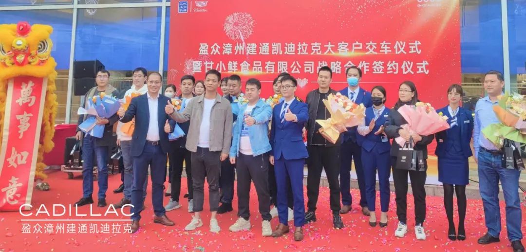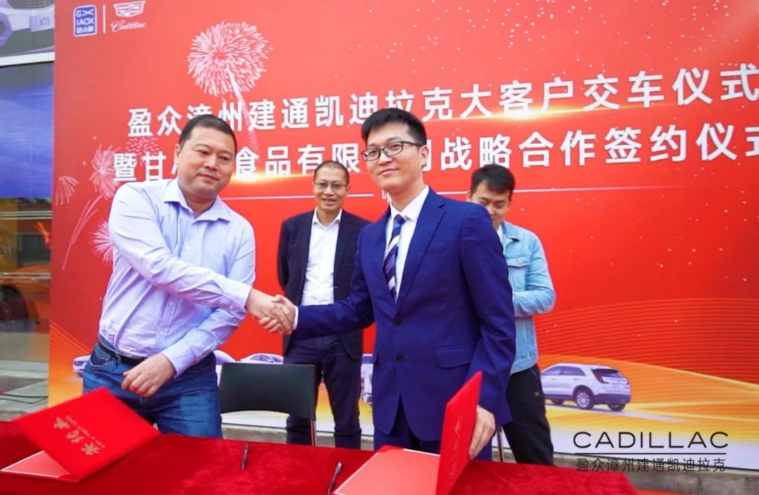 在到場(chǎng)人士的共同見(jiàn)證下,盈眾漳州建通凱迪拉克總經(jīng)理曾蛟龍與甘小鮮(福建)食品有限公司總經(jīng)理??徍炇鹆藨?zhàn)略合作協(xié)議,并現(xiàn)場(chǎng)完成首批八臺(tái)凱迪拉克交車儀式。