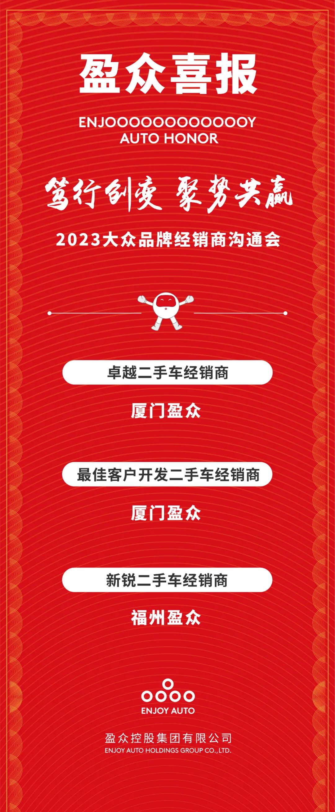 2月7日,以“篤行創(chuàng)變 聚勢共贏”為主題的2023一汽-大眾大眾品牌經(jīng)銷商溝通會在廣東珠海舉辦,2022年度一汽-大眾優(yōu)秀經(jīng)銷商及個人獲獎名單新鮮出爐。盈眾一汽-大眾團隊以